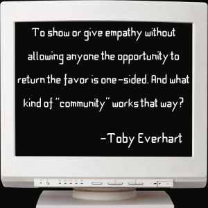My therapist told me community requires vulnerability, and I’ve been chewing on that for a while as I work on what it means for me to be vulnerable. To show or give empathy without allowing anyone the opportunity to return the favor is one-sided. And what kind of “community” works that way?